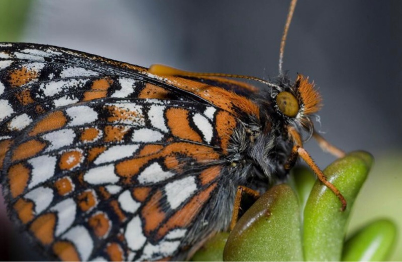A Taylor’s checkerspot alights on a plant at the Oregon Zoo’s butterfly conservation lab. Since 2004, the zoo has raised thousands of butterflies as part of a collaborative effort to save this endangered Northwest species. Photo by Michael Durham, courtesy of the Oregon Zoo.